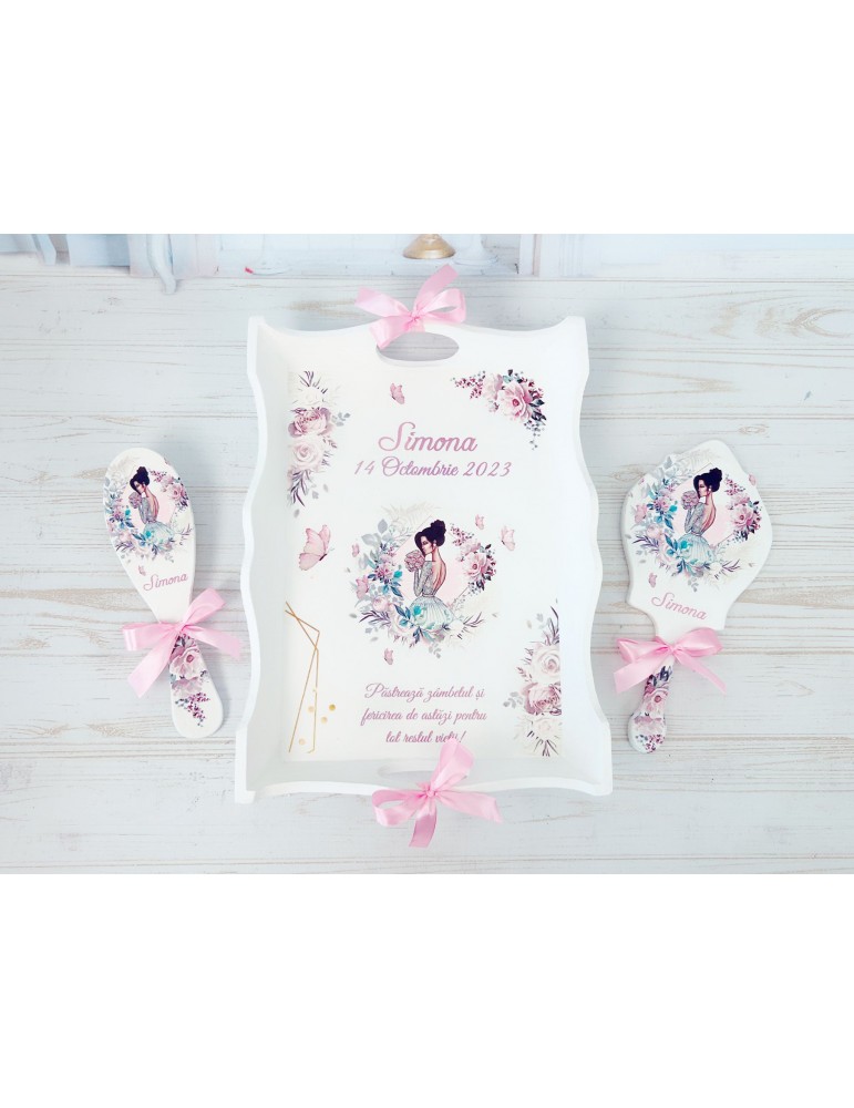 Descopera Setul Gatit Mireasa personalizat, un cadou unic si elegant, perfect pentru orice mireasa. Complet realizat manual in atelierul nostru, acest set este compus din trei piese esentiale: o tava, o oglinda de mana si o perie, toate fabricate din lemn sau MDF de cea mai buna calitate. Fiecare piesa este vopsita si lacuita manual cu mare atentie la detalii, folosind vopsea acrilica non-toxica pe baza de apa si lac rezistent, garantand astfel durabilitatea si un finisaj impecabil.