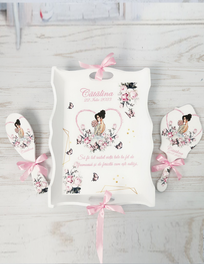 Descopera Setul Gatit Mireasa personalizat, un cadou unic si elegant, perfect pentru orice mireasa. Complet realizat manual in atelierul nostru, acest set este compus din trei piese esentiale: o tava, o oglinda de mana si o perie,  toate fabricate din lemn sau MDF de cea mai buna calitate. Fiecare piesa este vopsita si lacuita manual cu mare atentie la detalii, folosind vopsea acrilica non-toxica pe baza de apa si lac rezistent, garantand astfel durabilitatea si un finisaj impecabil.