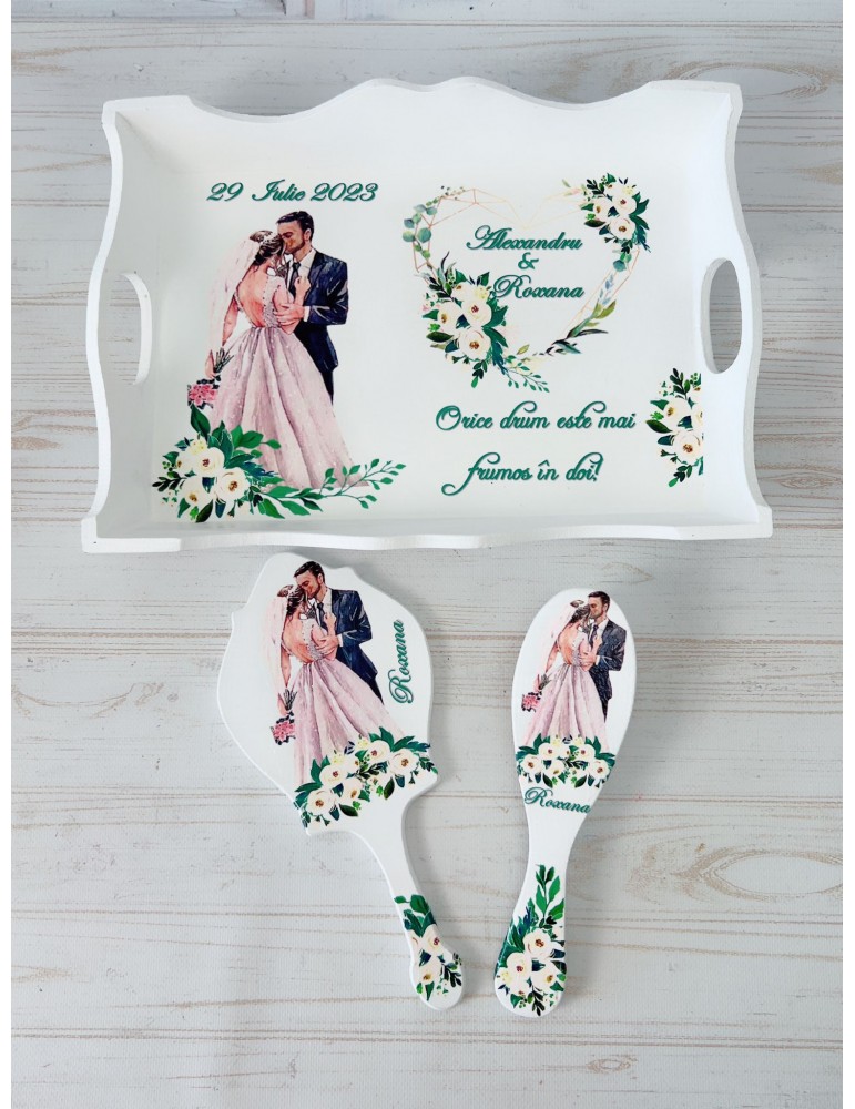 Descopera Setul de gatit mireasa personalizat, un cadou unic si elegant, perfect pentru orice mireasa. Complet realizat manual in atelierul nostru, acest set este compus din trei piese esentiale: o tava, o oglinda de mana si o perie,  toate fabricate din lemn sau MDF de cea mai buna calitate. Fiecare piesa este vopsita si lacuita manual cu mare atentie la detalii, folosind vopsea acrilica non-toxica pe baza de apa si lac rezistent, garantand astfel durabilitatea si un finisaj impecabil.