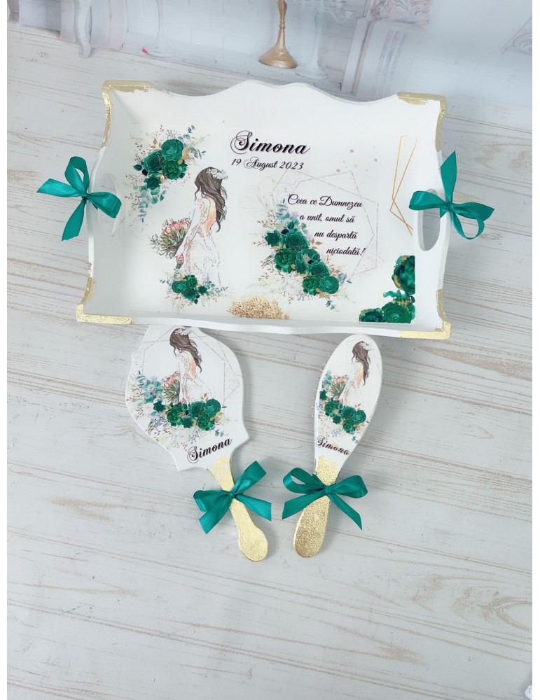Descopera Setul Gatit Mireasa personalizat, un cadou unic si elegant, perfect pentru orice mireasa. Complet realizat manual in atelierul nostru, acest set este compus din trei piese esentiale: o tava, o oglinda de mana si o perie, toate fabricate din lemn sau MDF de cea mai buna calitate. Fiecare piesa este vopsita si lacuita manual cu mare atentie la detalii, folosind vopsea acrilica non-toxica pe baza de apa si lac rezistent, garantand astfel durabilitatea si un finisaj impecabil.