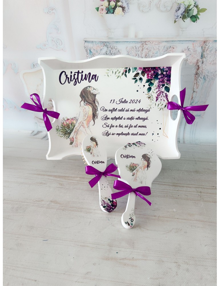 Descopera Setul Gatit Mireasa personalizat, un cadou unic si elegant, perfect pentru orice mireasa. Complet realizat manual in atelierul nostru, acest set este compus din trei piese esentiale: o tava, o oglinda de mana si o perie, toate fabricate din lemn sau MDF de cea mai buna calitate. Fiecare piesa este vopsita si lacuita manual cu mare atentie la detalii, folosind vopsea acrilica non-toxica pe baza de apa si lac rezistent, garantand astfel durabilitatea si un finisaj impecabil.