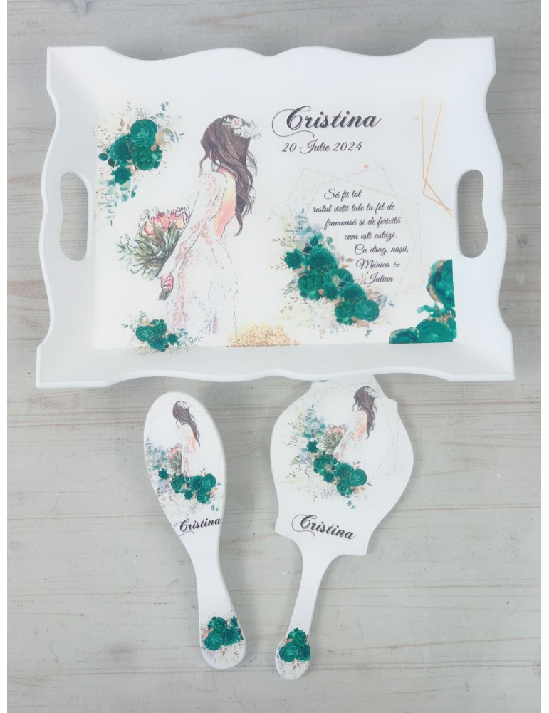 Descopera Setul Gatit Mireasa personalizat, un cadou unic si elegant, perfect pentru orice mireasa. Complet realizat manual in atelierul nostru, acest set este compus din trei piese esentiale: o tava, o oglinda de mana si o perie, toate fabricate din lemn sau MDF de cea mai buna calitate. Fiecare piesa este vopsita si lacuita manual cu mare atentie la detalii, folosind vopsea acrilica non-toxica pe baza de apa si lac rezistent, garantand astfel durabilitatea si un finisaj impecabil.