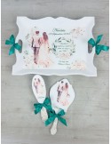 Descopera Setul de gatit mireasa personalizat, un cadou unic si elegant, perfect pentru orice mireasa. Complet realizat manual in atelierul nostru, acest set este compus din trei piese esentiale: o tava, o oglinda de mana si o perie, toate fabricate din lemn sau MDF de cea mai buna calitate. Fiecare piesa este vopsita si lacuita manual cu mare atentie la detalii, folosind vopsea acrilica non-toxica pe baza de apa si lac rezistent, garantand astfel durabilitatea si un finisaj impecabil.