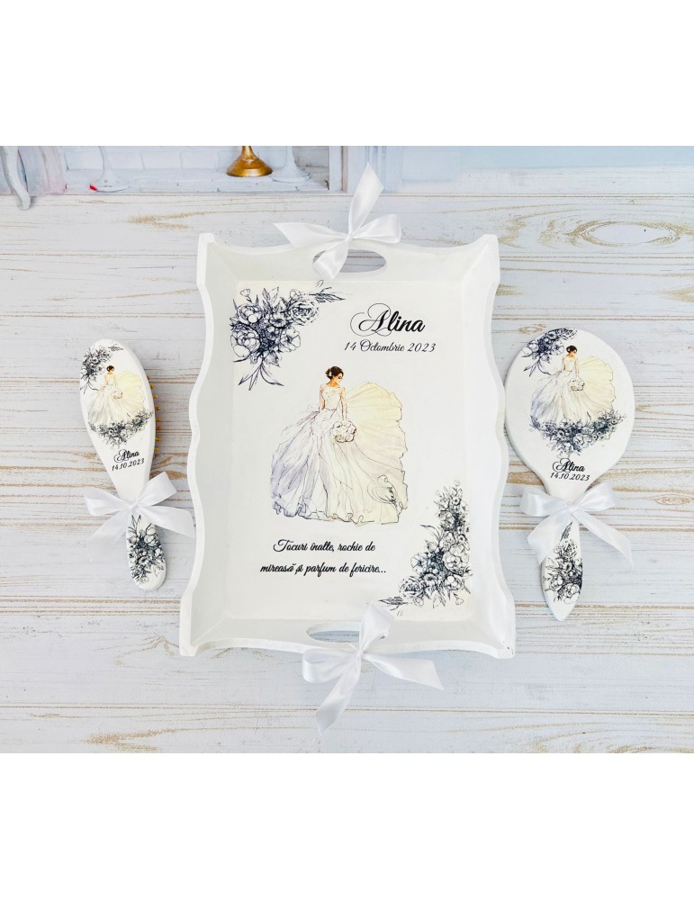 Descopera Setul Gatit Mireasa personalizat, un cadou unic si elegant, perfect pentru orice mireasa. Complet realizat manual in atelierul nostru, acest set este compus din trei piese esentiale: o tava, o oglinda de mana si o perie, toate fabricate din lemn sau MDF de cea mai buna calitate. Fiecare piesa este vopsita si lacuita manual cu mare atentie la detalii, folosind vopsea acrilica non-toxica pe baza de apa si lac rezistent, garantand astfel durabilitatea si un finisaj impecabil.