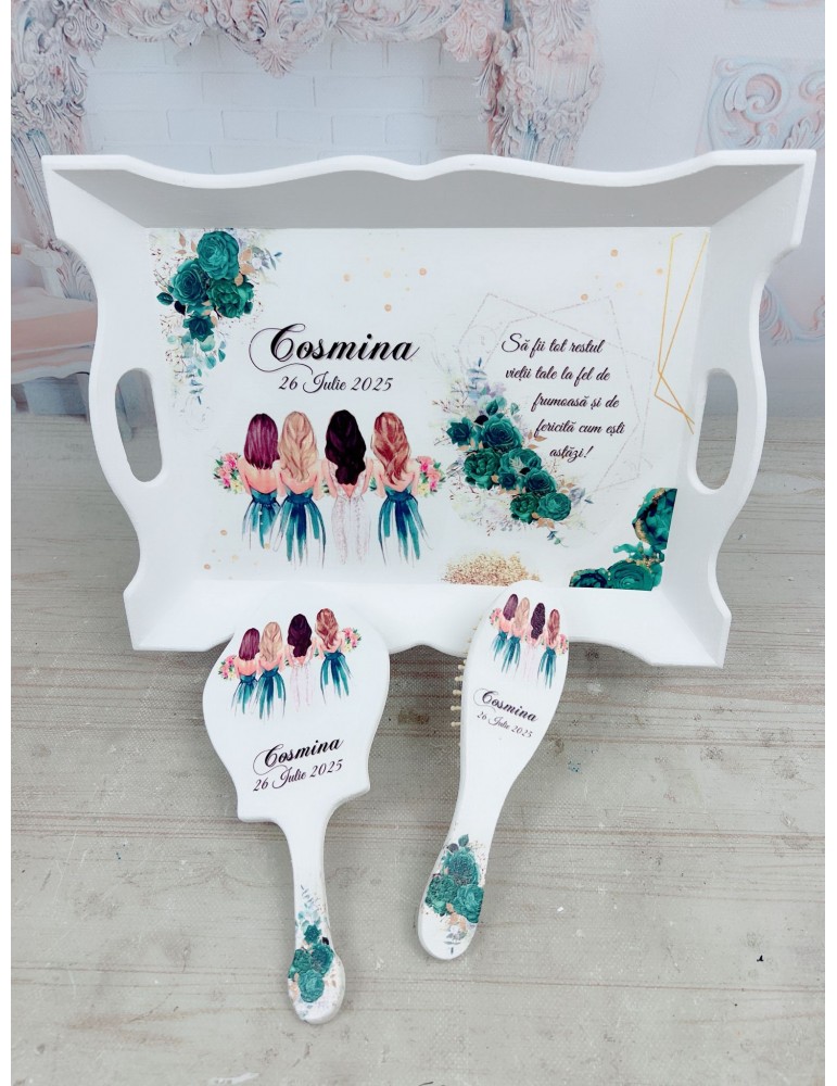 Descopera Setul de gatit mireasa personalizat, un cadou unic si elegant, perfect pentru orice mireasa. Complet realizat manual in atelierul nostru, acest set este compus din trei piese esentiale: o tava, o oglinda de mana si o perie, toate fabricate din lemn sau MDF de cea mai buna calitate. Fiecare piesa este vopsita si lacuita manual cu mare atentie la detalii, folosind vopsea acrilica non-toxica pe baza de apa si lac rezistent, garantand astfel durabilitatea si un finisaj impecabil.
