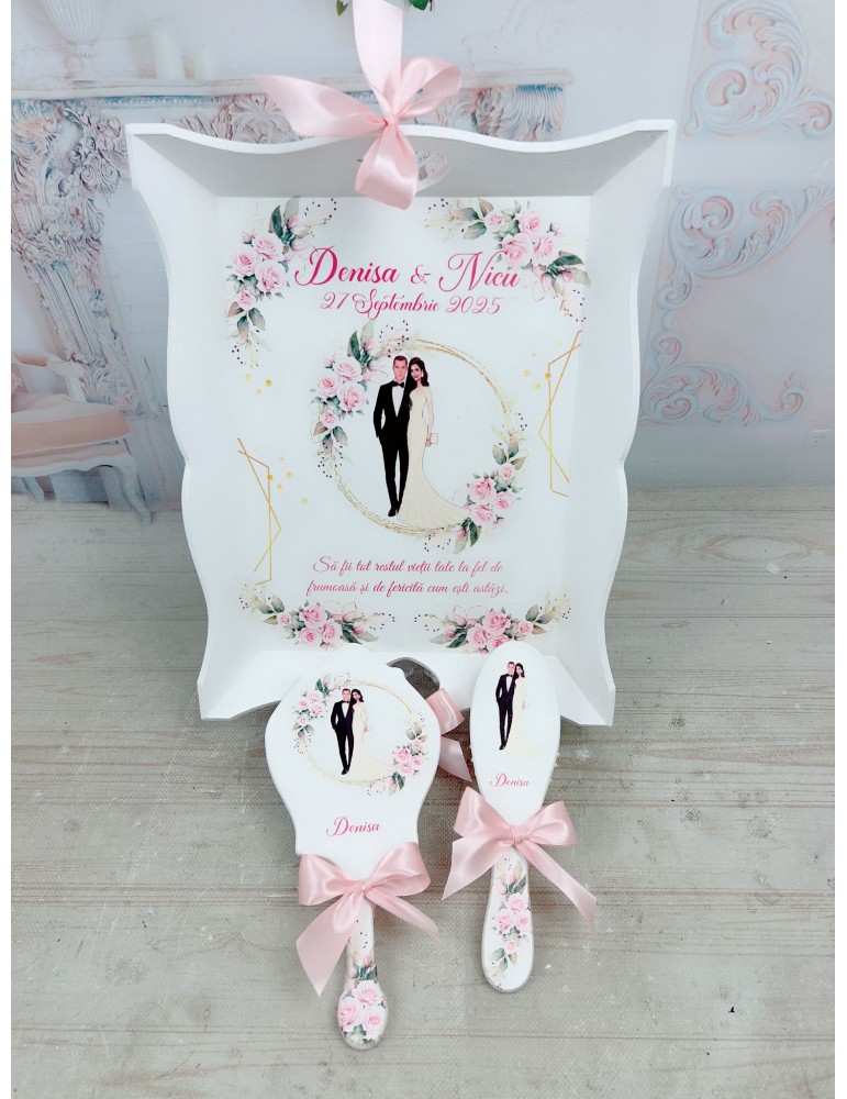 Descopera Setul de gatit mireasa personalizat, un cadou unic si elegant, perfect pentru orice mireasa. Complet realizat manual in atelierul nostru, acest set este compus din trei piese esentiale: o tava, o oglinda de mana si o perie, toate fabricate din lemn sau MDF de cea mai buna calitate. Fiecare piesa este vopsita si lacuita manual cu mare atentie la detalii, folosind vopsea acrilica non-toxica pe baza de apa si lac rezistent, garantand astfel durabilitatea si un finisaj impecabil.