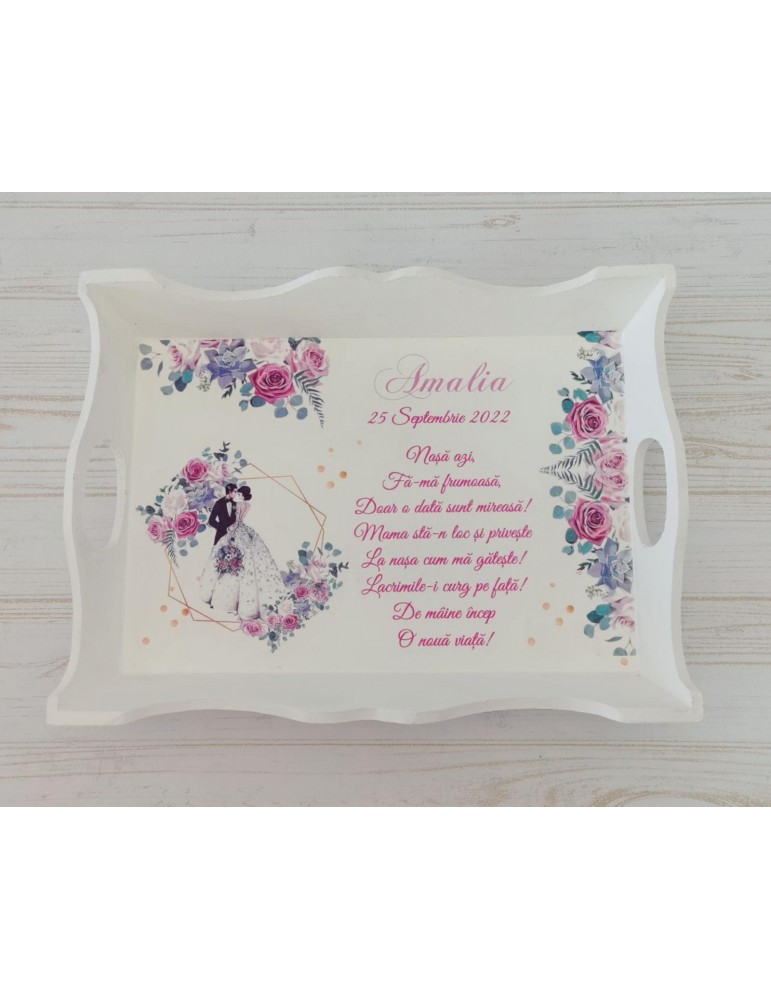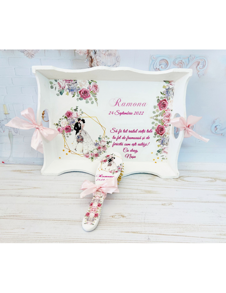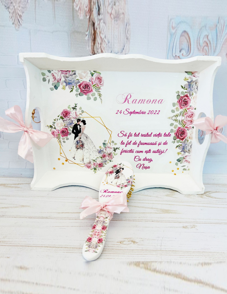 Descopera Setul Gatit Mireasa personalizat, un cadou unic si elegant, perfect pentru orice mireasa. Complet realizat manual in atelierul nostru, acest set este compus din trei piese esentiale: o tava, o oglinda de mana si o perie, toate fabricate din lemn sau MDF de cea mai buna calitate. Fiecare piesa este vopsita si lacuita manual cu mare atentie la detalii, folosind vopsea acrilica non-toxica pe baza de apa si lac rezistent, garantand astfel durabilitatea si un finisaj impecabil.