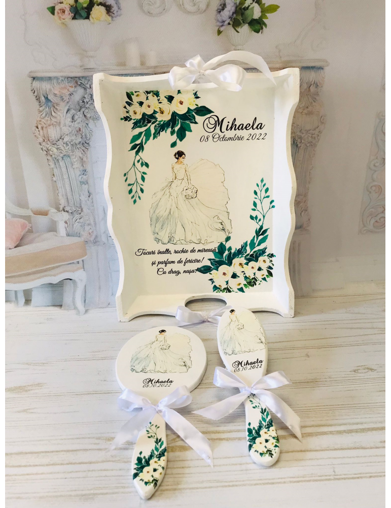 Descopera Setul Gatit Mireasa personalizat, un cadou unic si elegant, perfect pentru orice mireasa. Complet realizat manual in atelierul nostru, acest set este compus din trei piese esentiale: o tava, o oglinda de mana si o perie,  toate fabricate din lemn sau MDF de cea mai buna calitate. Fiecare piesa este vopsita si lacuita manual cu mare atentie la detalii, folosind vopsea acrilica non-toxica pe baza de apa si lac rezistent, garantand astfel durabilitatea si un finisaj impecabil.