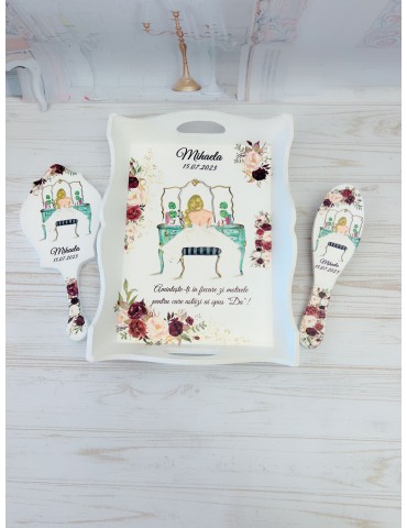 Descopera Setul Gatit Mireasa personalizat, un cadou unic si elegant, perfect pentru orice mireasa. Complet realizat manual in atelierul nostru, acest set este compus din trei piese esentiale: o tava, o oglinda de mana si o perie, toate fabricate din lemn sau MDF de cea mai buna calitate. Fiecare piesa este vopsita si lacuita manual cu mare atentie la detalii, folosind vopsea acrilica non-toxica pe baza de apa si lac rezistent, garantand astfel durabilitatea si un finisaj impecabil.