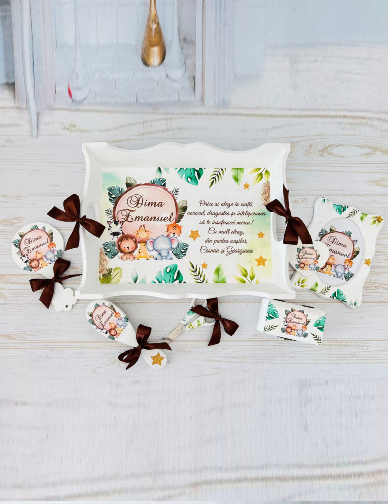 6 elemente: tavita, perie, oglinda, rama foto, cutiuta suvite, forfecuta
