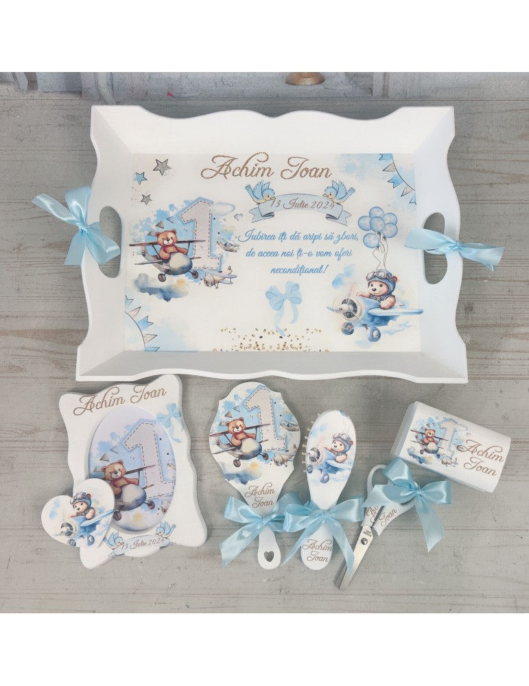 - 6 elemente: tavita, perie, oglinda, rama foto, cutiuta suvite, forfecuta