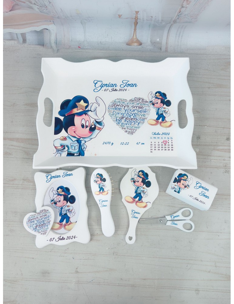 - 6 elemente: tavita, perie, oglinda, rama foto, cutiuta suvite, forfecuta