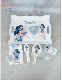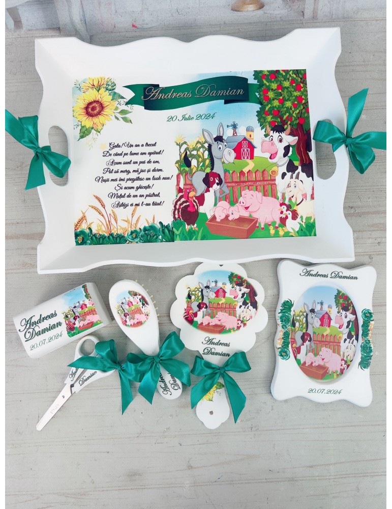 - 6 elemente: tavita, perie, oglinda, rama foto, cutiuta suvite, forfecuta