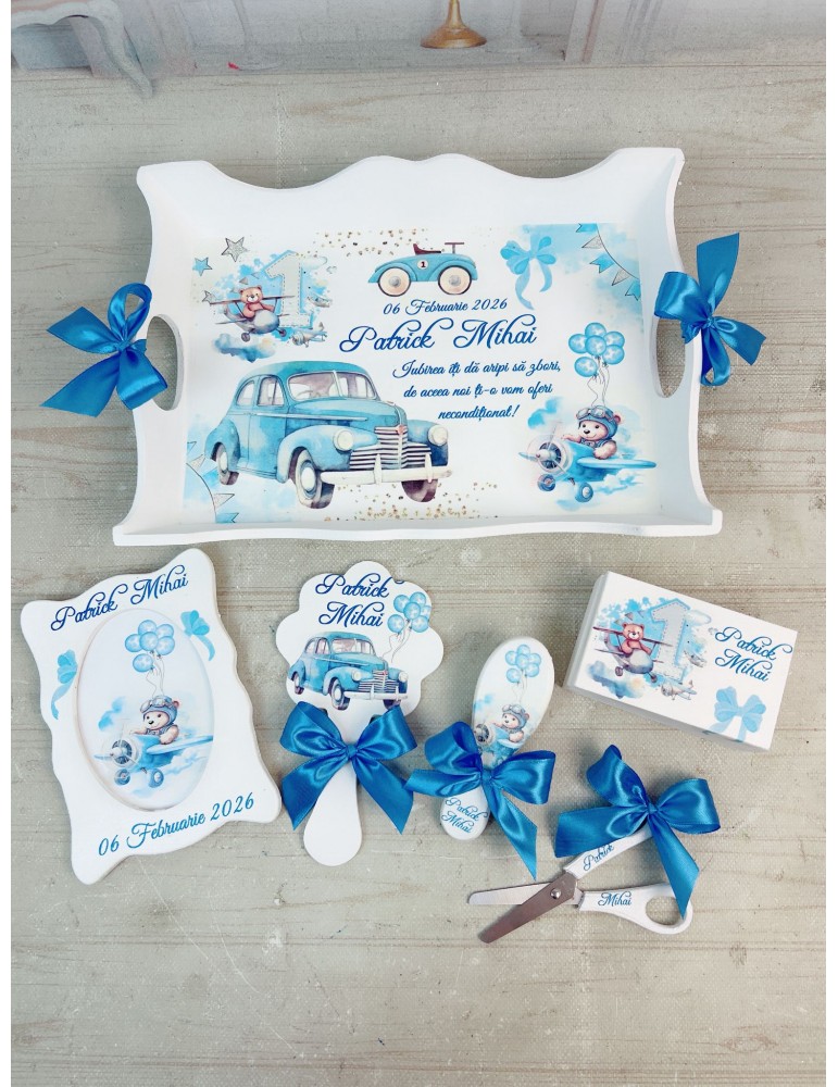 Sărbătorește prima aniversare a copilului cu un set de moț cu tematica Ursulet si Masinute, creat special pentru ceremonia tradițională de tăiere a moțului sau ruperea turtei. Setul este lucrat manual, cu atenție la fiecare detaliu, fiind realizat din materiale și produse non-toxice, sigure pentru cei mici.