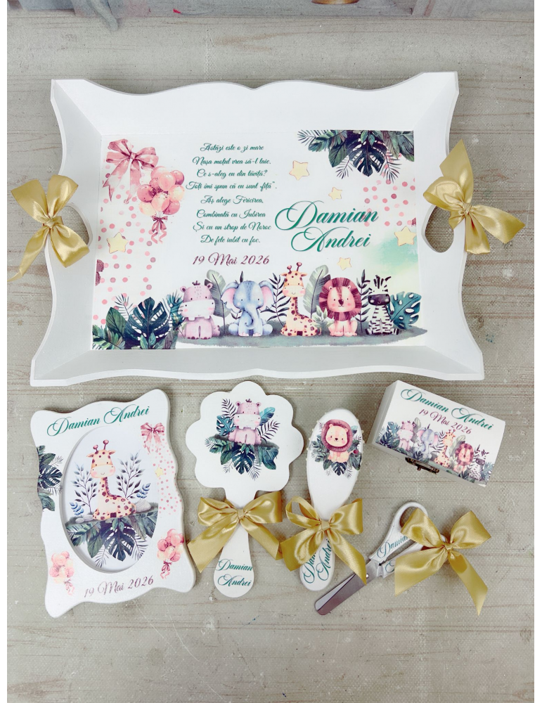 - 6 elemente: tavita, perie, oglinda, rama foto, cutiuta suvite, forfecuta