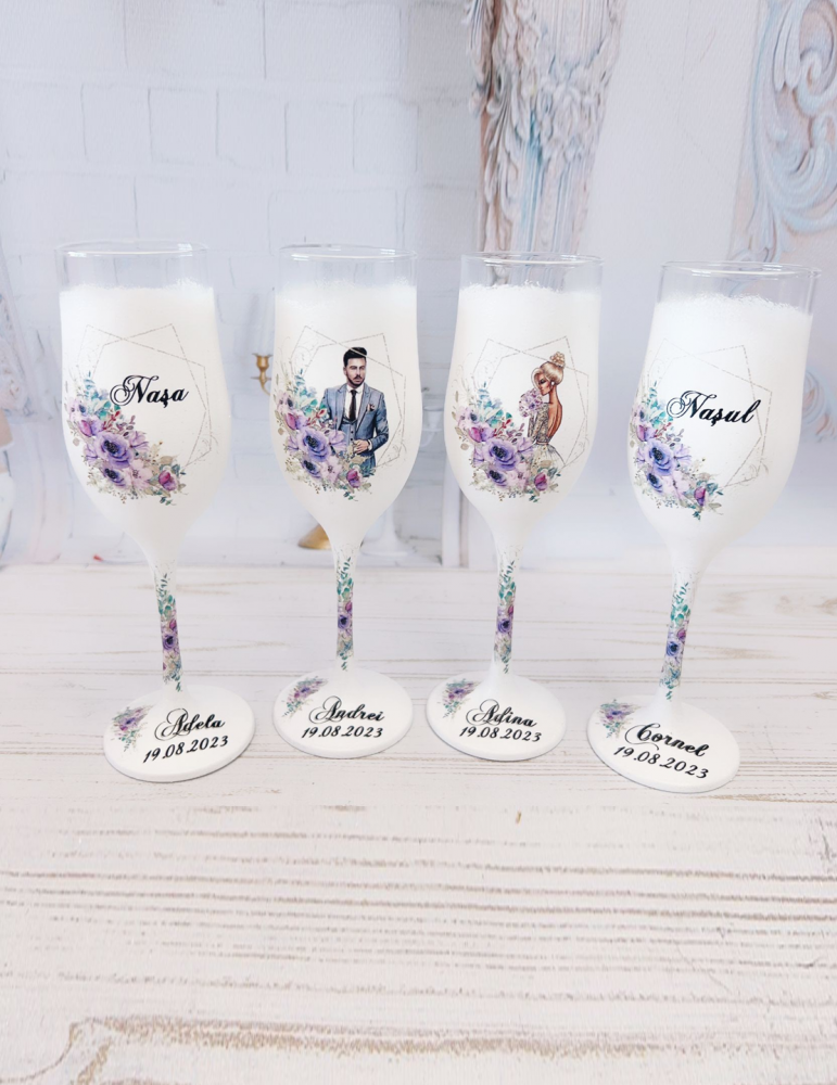 Pretul afisat se refera la un singur pahar si include doar personalizarea de baza: inlocuire nume miri si data eveniment.