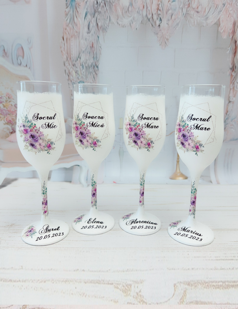 Pretul se refera la un singur pahar si include personalizarea cu numele mirilor/nasilor si data evenimentului.