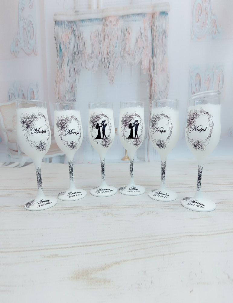 Pretul se refera la un singur pahar si include personalizarea cu numele mirilor/nasilor si data evenimentului.