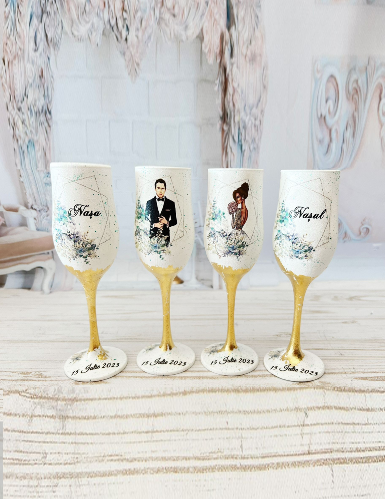 Pahare nunta personalizate pentru miri si nasi cu nuante de alb-verde si foita din aur