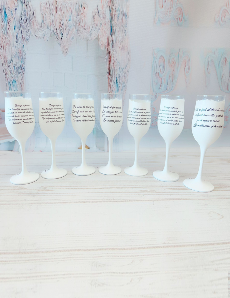 Pretul afisat se refera la un singur pahar si include doar personalizarea de baza: inlocuire nume miri si data eveniment.