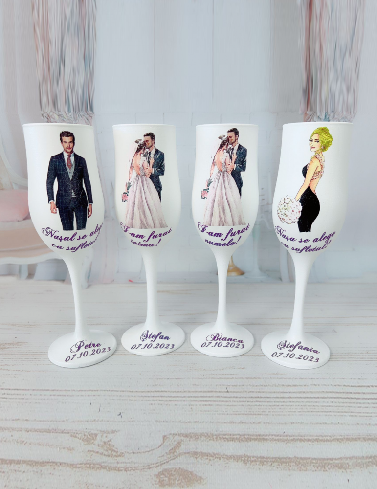 Pretul afisat se refera la un singur pahar si include doar personalizarea de baza: inlocuire nume miri si data eveniment.