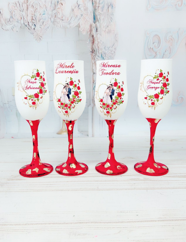 Pahare nunta personalizate pentru miri si nasi nuante de rosu cu foita aurie
