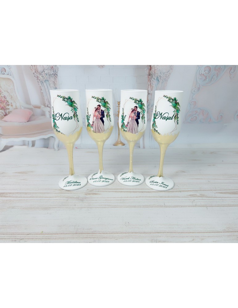 Pretul afisat se refera la un singur pahar si include doar personalizarea de baza: inlocuire nume miri si data eveniment.