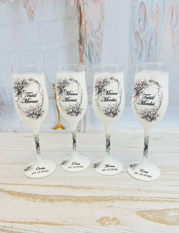 Pretul se refera la un singur pahar si include personalizarea cu numele mirilor/nasilor si data evenimentului.