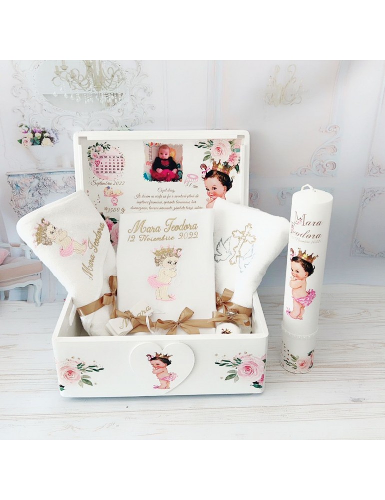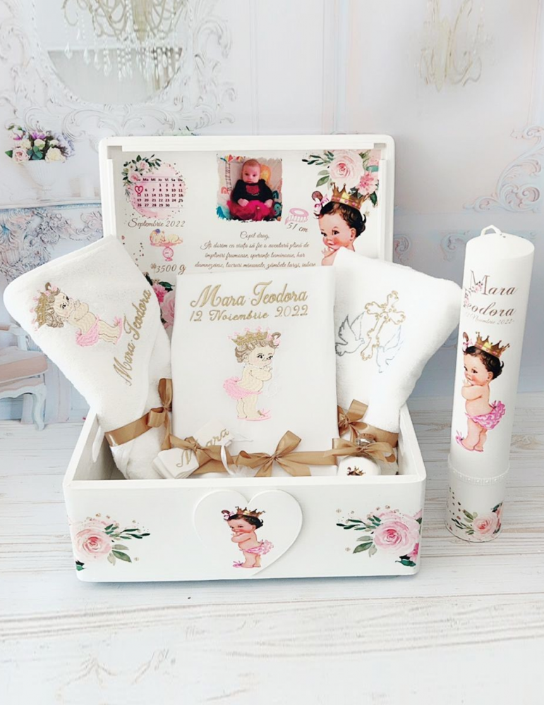 Descoperă seturile de botez personalizate pentru fetițe, create pentru a transforma ceremonia de botez într-un moment cu adevărat special. Fiecare element al setului este realizat cu atenție la detalii și personalizat pentru a reflecta tematica dorită, oferindu-ți posibilitatea să păstrezi amintiri prețioase pentru o viață întreagă.