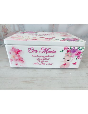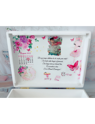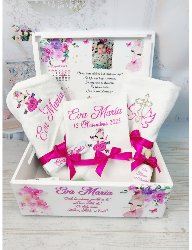 Pretul afisat se refera la setul de botez ce include: cutie amintiri, trusou brodat - personalizarea este inclusa in pret - Dimensiuni cutie de amintiri