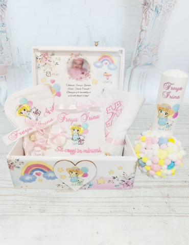 Ce contine setul de botez cu tematica "Fetita cu baloane"?