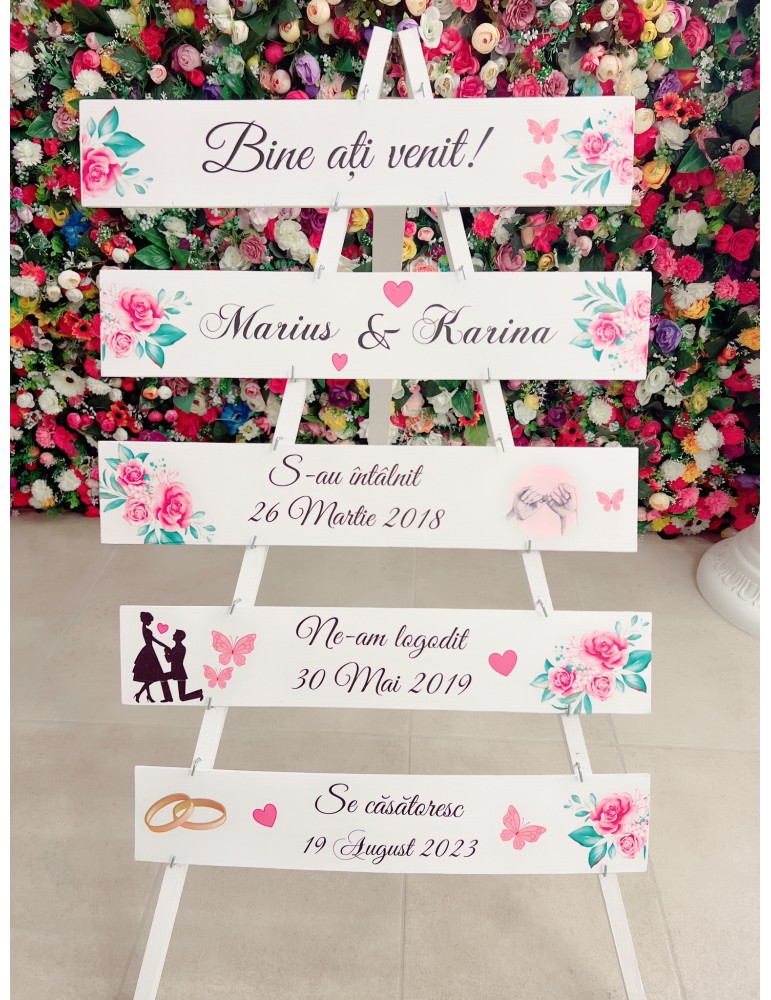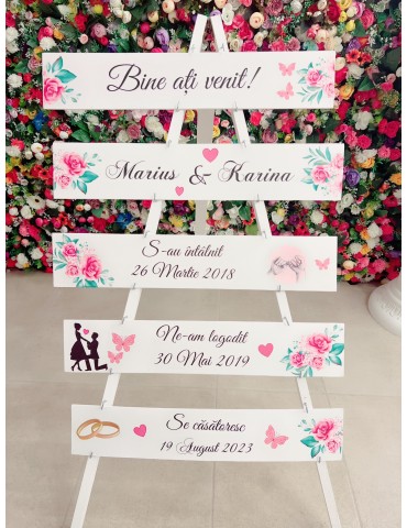 Stativul de nunta sau panoul de la intrare va aduce un plus de farmec decorului nuntii si devine totodata un simbol al poveștii voastre de dragoste.
