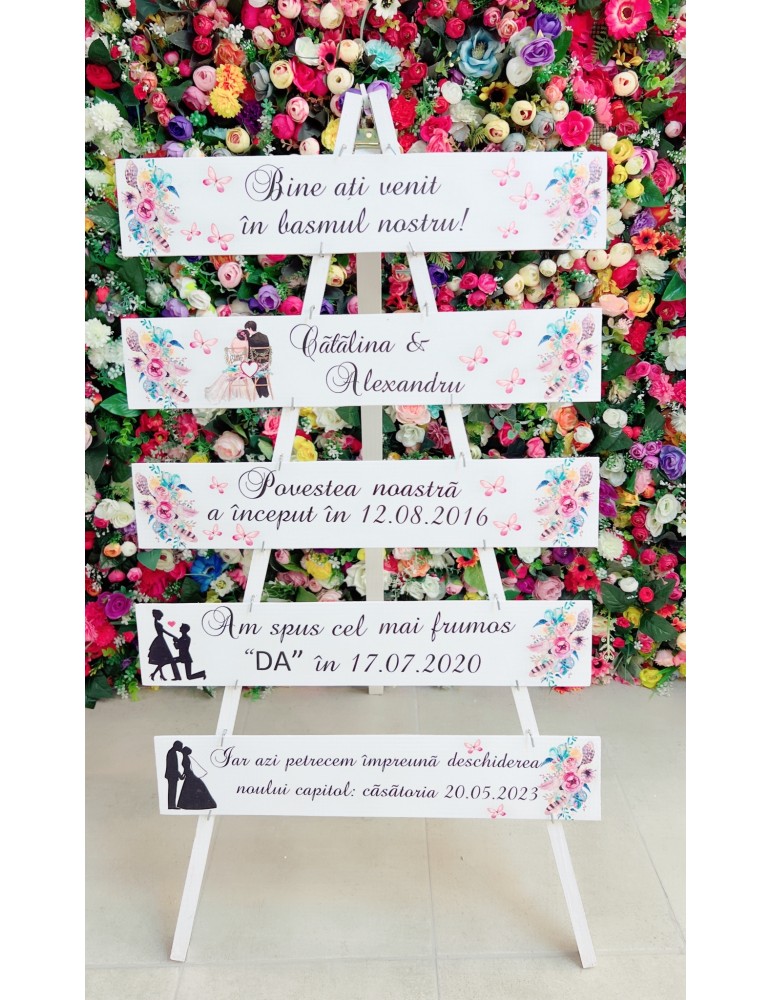 Stativul de nunta sau panoul de la intrare va aduce un plus de farmec decorului nuntii si devine totodata un simbol al poveștii voastre de dragoste.