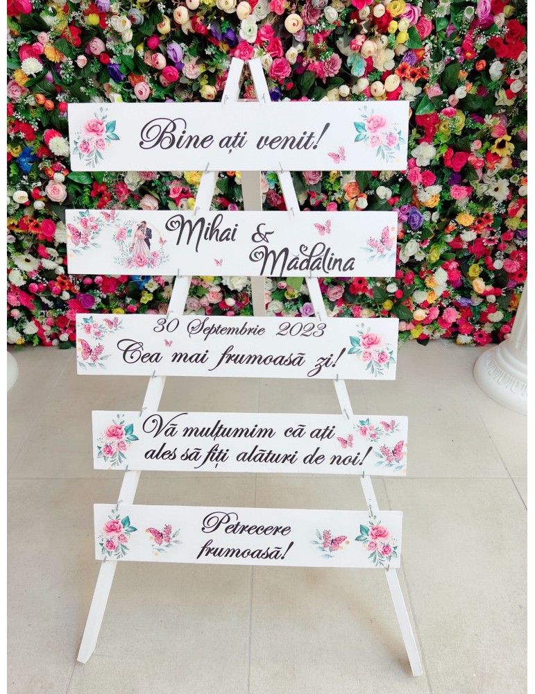 Stativul de nunta sau panoul de la intrare va aduce un plus de farmec decorului nuntii si devine totodata un simbol al poveștii voastre de dragoste.