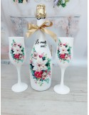 Fiecare detaliu este realizat cu grijă: sticla de șampanie este decorată prin tehnica decoupage și protejată cu 3 straturi de lac pentru rezistență și durabilitate, iar paharele sunt personalizate cu numele destinatarului, oferind un plus de eleganță și unicitate.