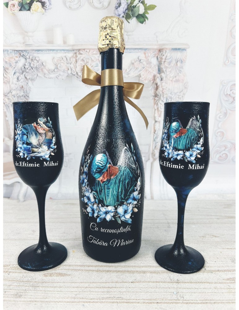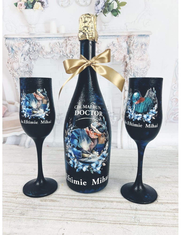 Sticla, decorată manual cu o imagine sugestivă și mesajul „Cel mai bun doctor”, alături de două pahare personalizate cu numele destinatarului, transformă acest dar într-o amintire unică. Fiecare detaliu este realizat cu grijă și pasiune, pentru ca setul să reflecte respectul și recunoștința oferite din inimă.