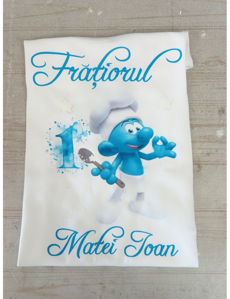 Tricou personalizat cu tematica Strumfi pentru petrecerea de mot