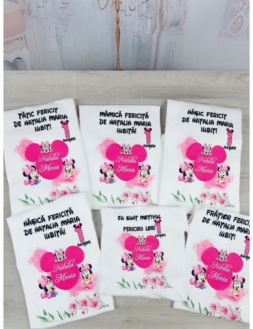 Celebrează petrecerea de moț cu tricouri personalizate, realizate din bumbac 100% de calitate, confortabil și delicat cu pielea sensibilă. Tricourile au tematică Minnie Mouse, cu detalii simpatice în nuanțe de roz, perfecte pentru o petrecere plină de veselie și culoare.