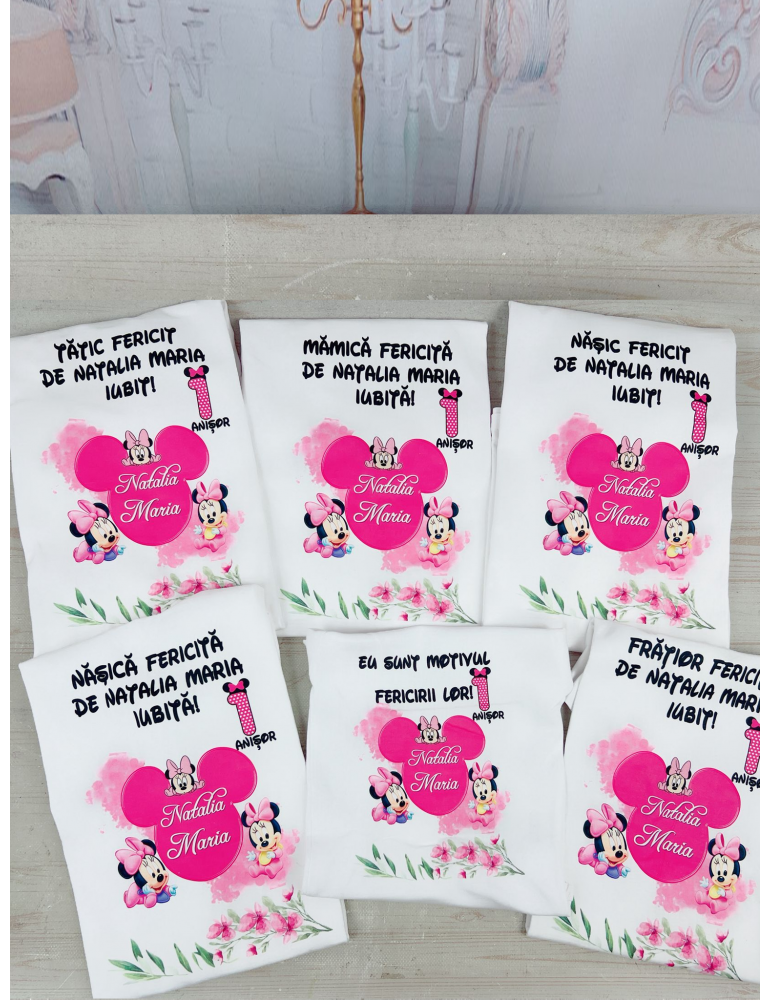 Tricouri 100% bumbac, personalizate cu tematică Minnie în nuanțe de roz. Disponibile în mărimi pentru copii (1-12 ani) și adulți (S-XXL). Perfecte pentru o petrecere de moț coordonată, se pot asorta cu tava de moț personalizată.
