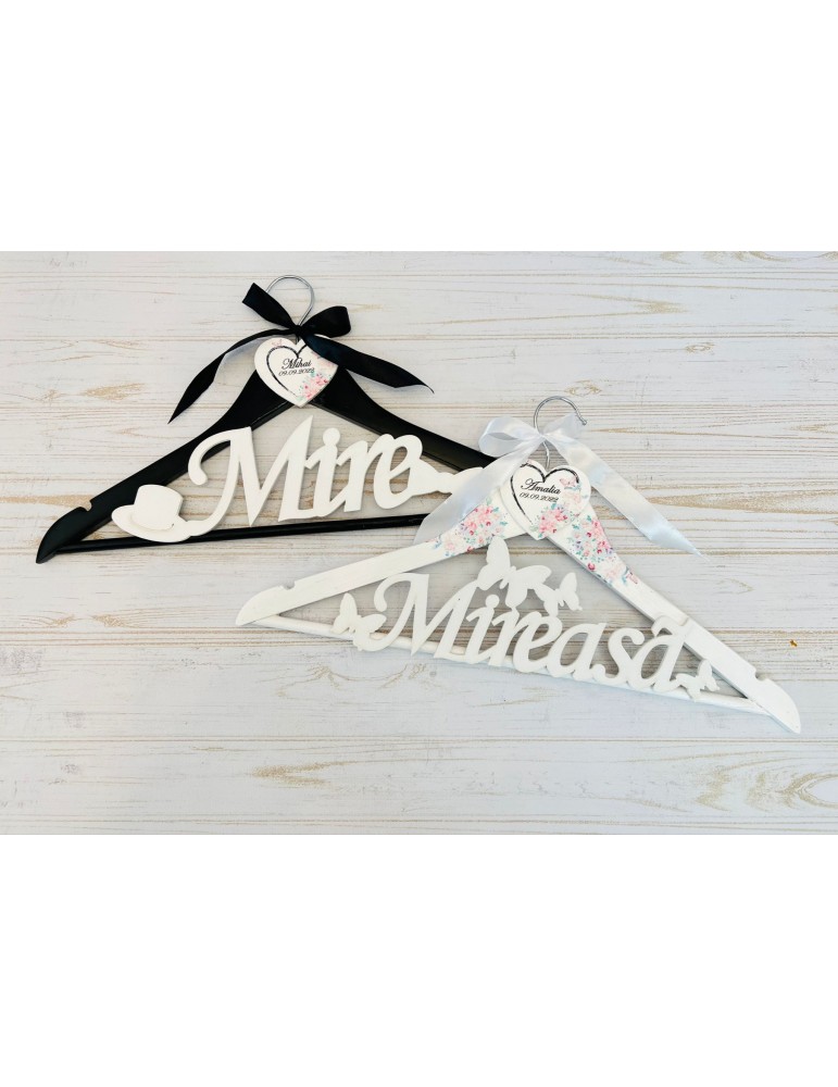 Un set de umerase personalizate cu tematica nuntii este cel mai frumos suport pe care hainele de nunta pot fi asezate cu eleganta.
