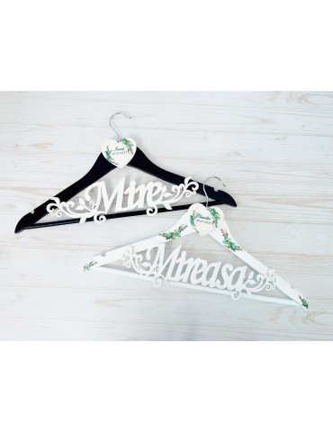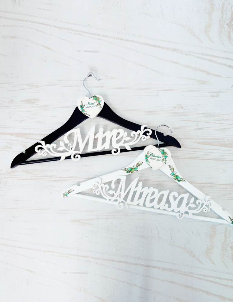 Un set de umerase personalizate cu tematica nuntii este cel mai frumos suport pe care hainele de nunta pot fi asezate cu eleganta.